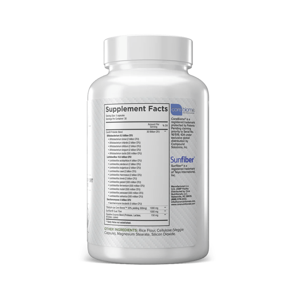 القناة الهضمية (أو الجهاز الهضمي) هي أحد أكبر الأجهزة المسؤولة عن الحفاظ على صحة أجسامنا. يمر الطعام ومجموعة متنوعة من العناصر الغذائية عبر أجزائها المنفصلة، حيث يتم هضمها وامتصاصها، ثم تُنقل إلى وجهتها النهائية لتبدأ عملها. بالإضافة إلى هذا الطعام، تمر أعداد لا حصر لها من الكائنات الحية الدقيقة من البيئة عبر الأمعاء، وقد يكون بعضها ضارًا بالصحة ويؤثر على سلامة الجهاز الهضمي. صُمم Core GUT لتوفير دعم شامل للجهاز الهضمي من خلال البكتيريا النافعة في مزيج بروبيوتيك مُخصص، وشكل غذائي مناسب لهذه الكائنات الدقيقة في بريبيوتيك، ومنتجات ثانوية مفيدة في بوستبيوتيك، وإنزيمات هضمية للمساعدة في هضم العناصر الغذائية الأساسية. وقد ثبت أن هذا المزيج من المكونات يدعم نمو بكتيريا الأمعاء الصحية*، ويعزز وظيفة المناعة*، ويوفر الدعم لسلامة بطانة الأمعاء*، ويُظهر تأثيرات وقائية على بيئة الأمعاء*.