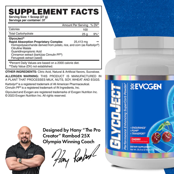 تقديم GlycoJect™ – إيفوجين محلول التغذية المتميز من شركة Nutrition's Elite لتكملة الكربوهيدرات قبل وبعد التمرين. هذه التركيبة الفريدة لتكملة الكربوهيدرات قبل وبعد التمرين ونقل العناصر الغذائية هي المعزز المثالي للأداء لأي رياضي تقريبًا!