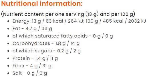 9 بروتين 36 دهون 11 كربوهيدرات 464 سعرة حرارية